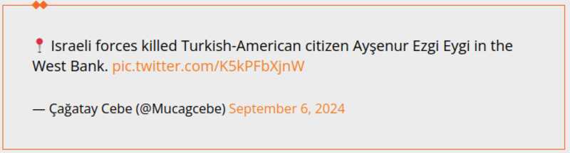 📍 Israëlische strijdkrachten doodden Turks-Amerikaanse burger Ayşenur Ezgi Eygi op de Westelijke Jordaanoever. pic.twitter.com/K5kPFbXjnW – Çağatay Cebe (@Mucagcebe) 6 september 2024