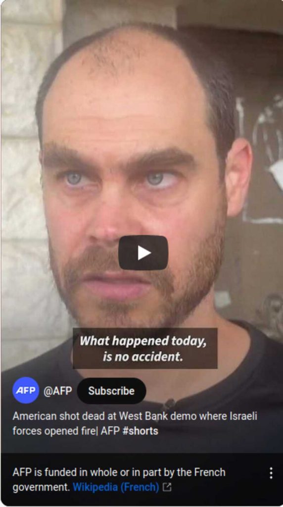 “Ik weet niet hoe ik dit moet zeggen. Er is geen gemakkelijke manier. Ik wou dat ik iets welsprekends kon [zeggen], maar ik kan niet door mijn snikkende tranen heen…. mijn vriendin, kameraad en reispartner naar Palestina, is zojuist in het hoofd geschoten en vermoord door de Israëlische bezettingstroepen. Moge ze rusten in kracht. Ze is nu een van de vele martelaren in deze strijd.”